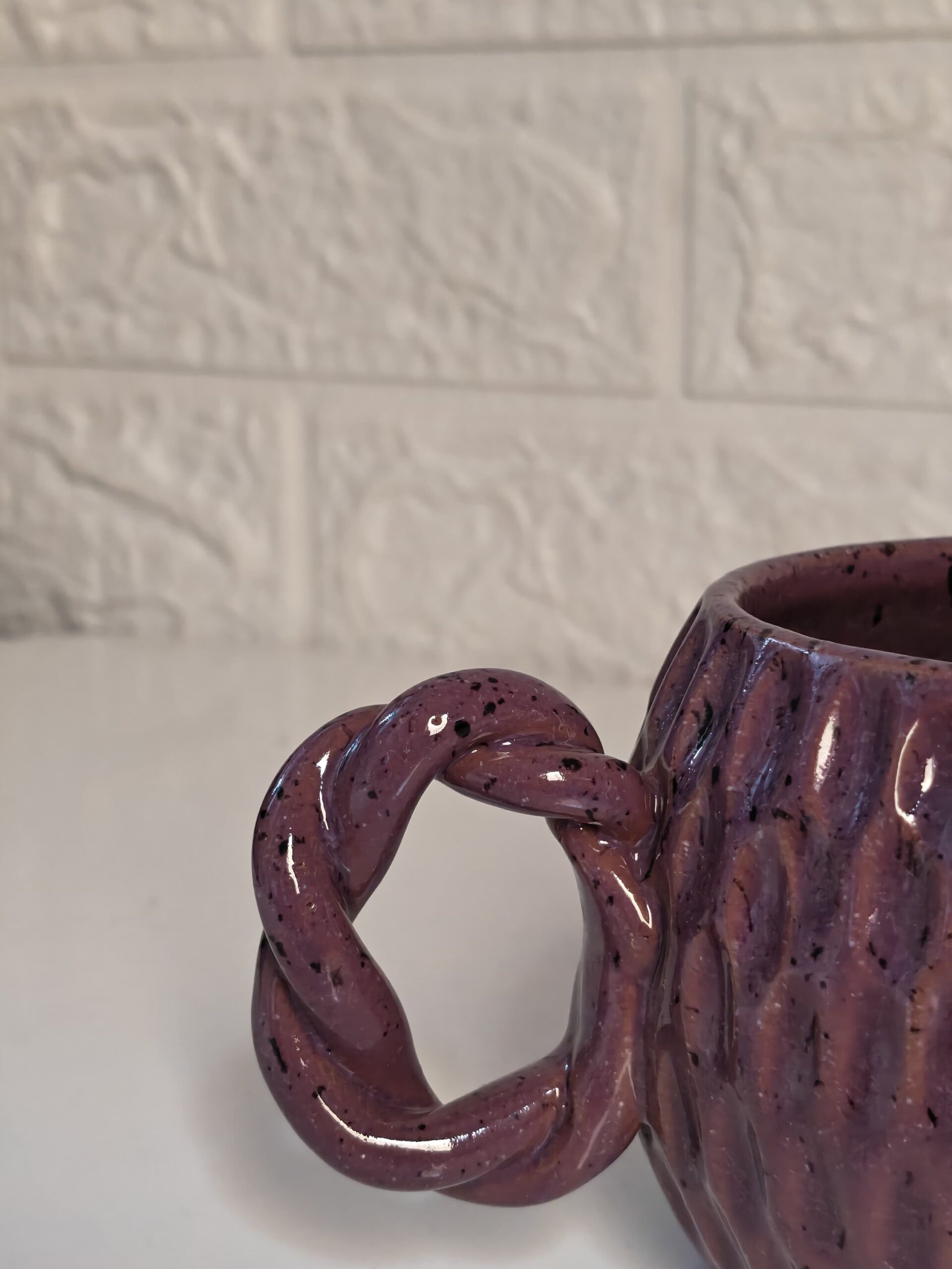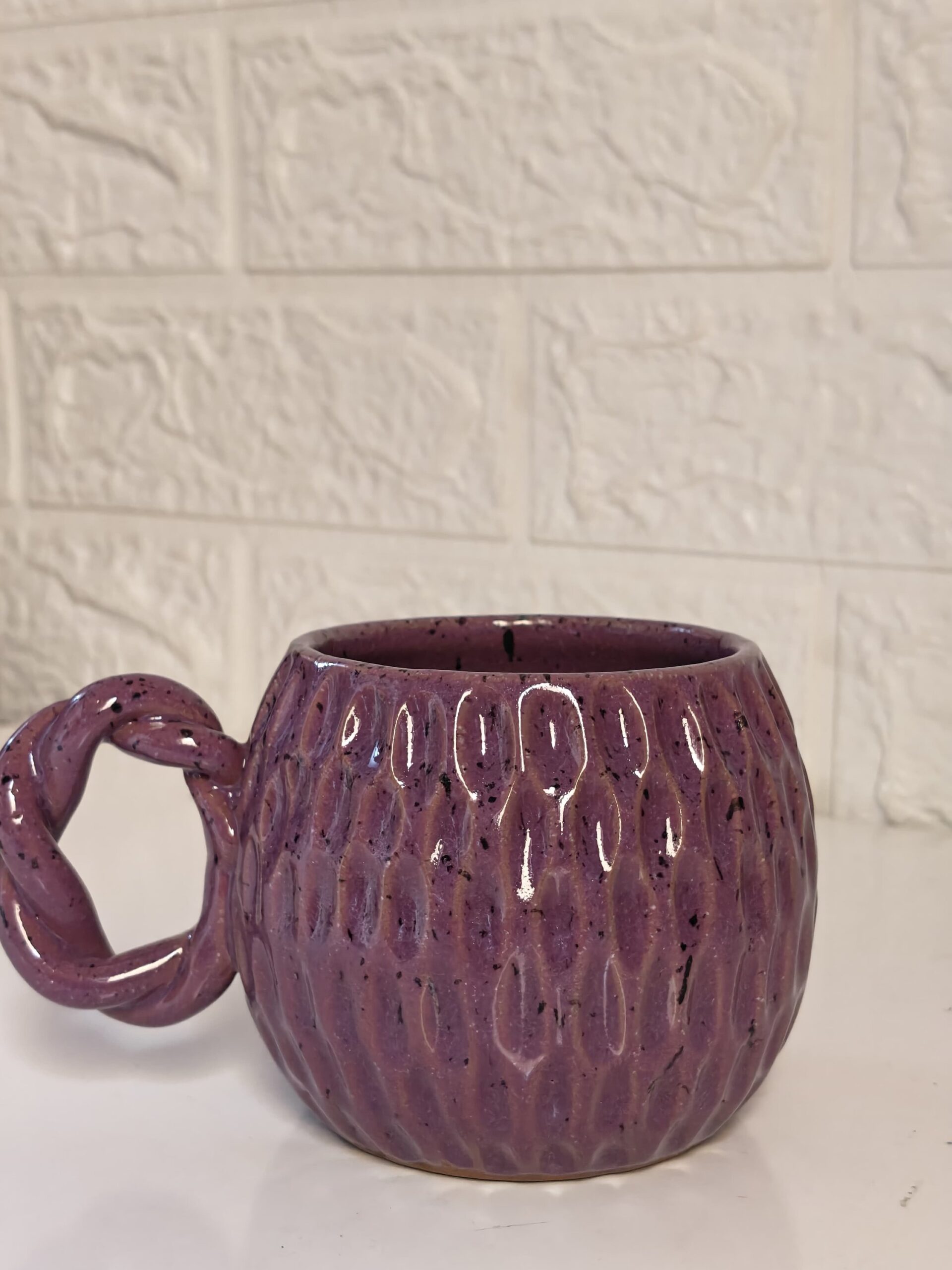مج فخار هاند ميد بيدخل الفرن والمايكرويف وبيتحمل درجه حراره عاليه حجم المج وسط ٢٥٠ ميللي